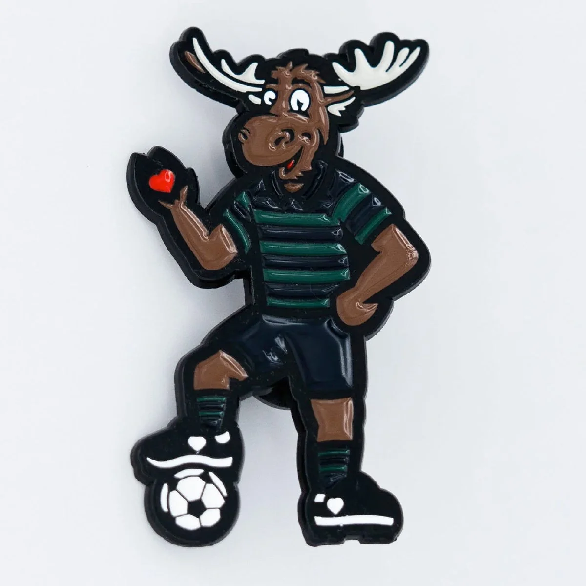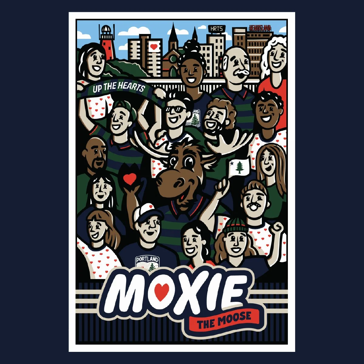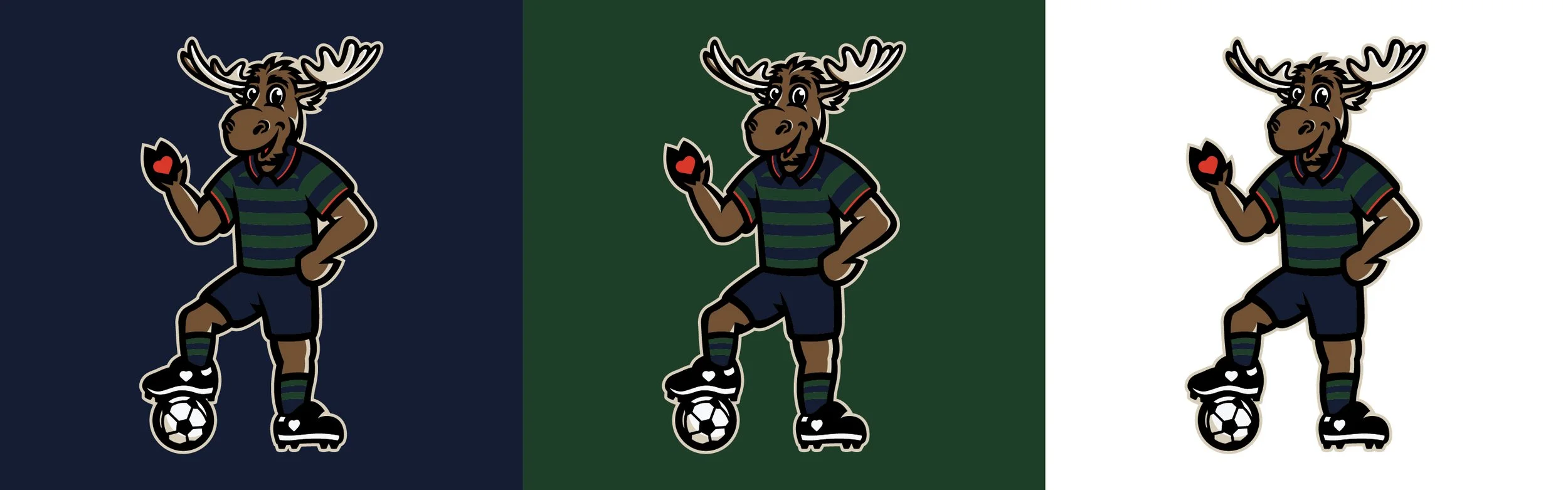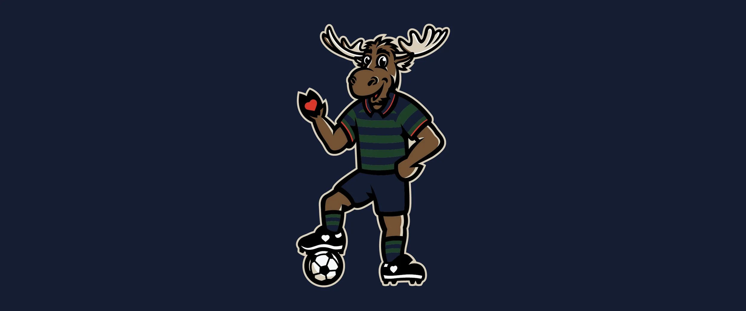 In the team’s inaugural season, the Portland Hearts of Pine took over the city, selling out all their home games and becoming the hottest ticket in town. Their mascot, Moxie the Moose, was introduced and I was tasked with creating a mascot mark as well as wordmarks and a limited run poster. Moxie is wearing the team’s famous home striped kit, with his foot on a ball and his hand raised showing the heart on his palm. We got pretty fun with the wordmarks as well, providing versions with moose antlers on the custom type.