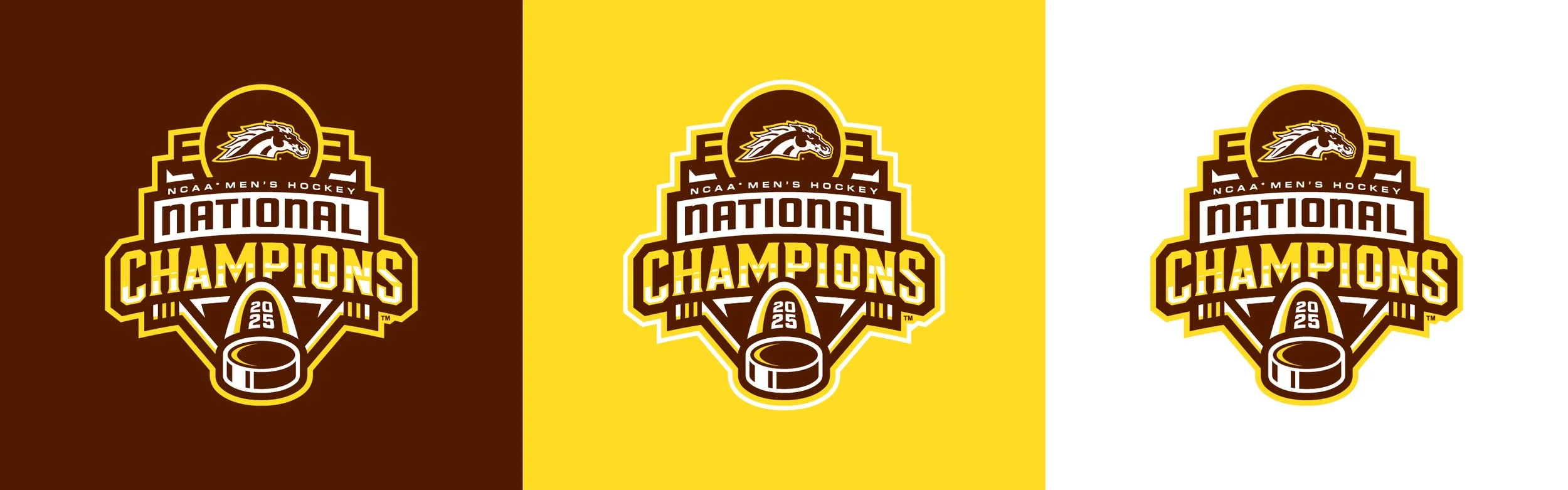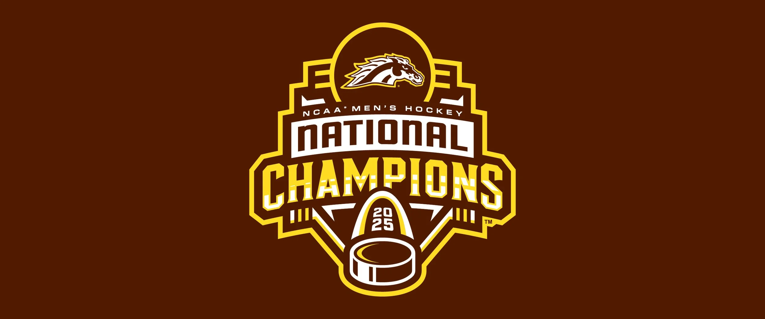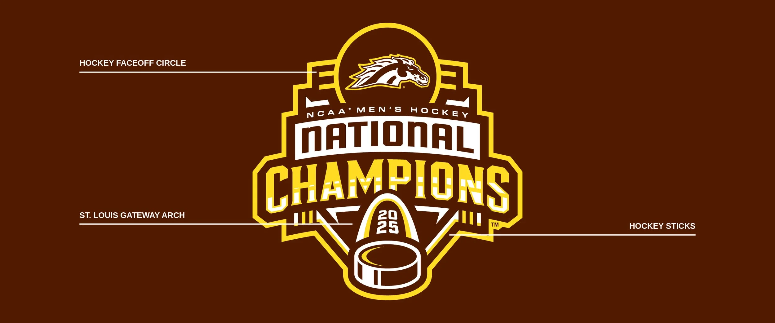 In 2025, Western Michigan captured its first national title in men’s hockey. The Frozen Four was held in St. Louis, so the Gateway Arch made an appearance, containing the date of the Broncos’ triumph.